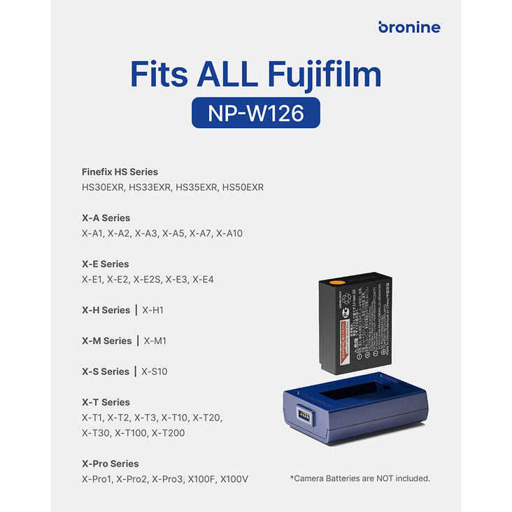 Compatible with: FUJIFILM FinePix HS Series, HS30EXR, HS33EXR, HS35EXR, HS50EXR, X-A1, X-A2, X-A3, X-A5, X-A7, X-A10, X-E1, X-E2, X-E2S, X-E3, X-E4, X-H1, X-M, X-M1, X-S, X-S10, X-T1, X-T2, X-T3, X-T10, X-T20, X-T30, X-T100, X-T200, X-Pro1, X-Pro2, X-Pro3, X100F, and X100V.