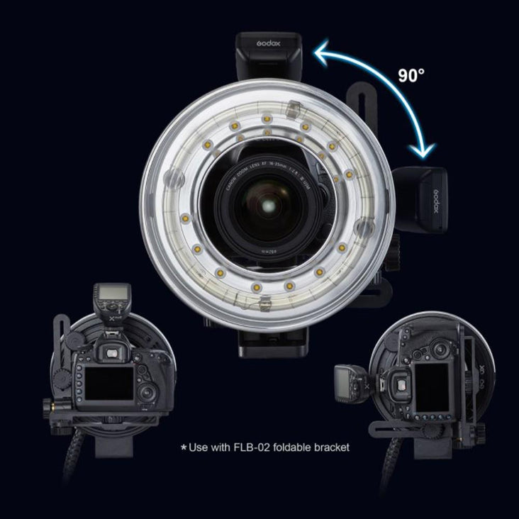 Quick Rotating Camera Bracket is a quick and simple way to turn the camera between vertical and horizontal view when using with the Godox R1200 ring flash, enabling photographers to fully concentrate on their creation without interference even under intensive shootings.
