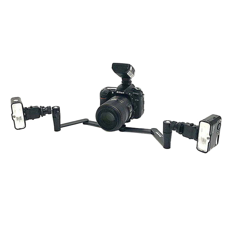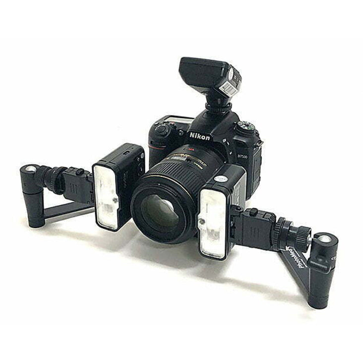 The PhotoMed R2 Dual Point Flash Bracket allows you to position small, lightweight flash heads on either side of the lens for intraoral views or separate them by as much as 24 inches for anterior esthetic views and lab communication. The bracket utilizes tension hinges between the bracket arms that allow you to change their position while maintaining tension so that the arms do not move while you are shooting.The R2 Bracket was designed to work with DSLR cameras, If you are using a mirrorless camera, you will need the R2 MIrrorless Adapter Kit along with the R2 Bracket. The kit adds a plate between the camera and the R2 Bracket that adds the space necessary so that the bracket does not contact the macro lens (this kit is not part of the R2 Bracket and needs to be seperatly purchased).