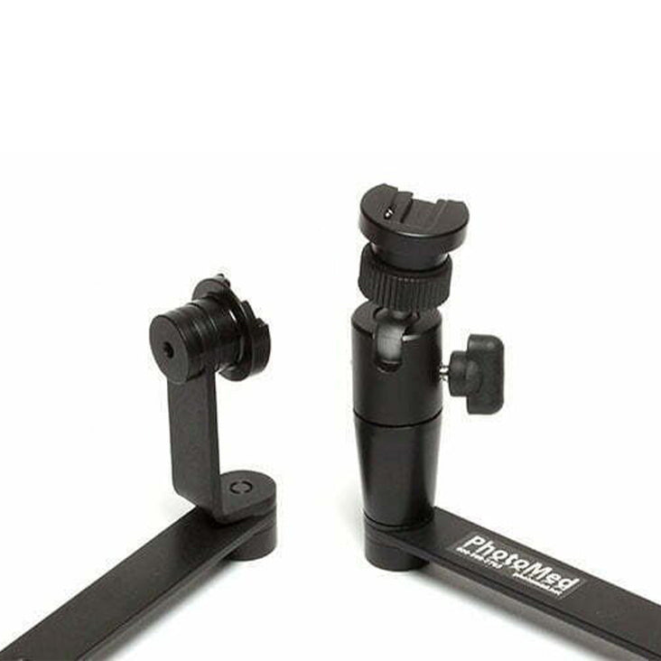 The PhotoMed R2UW D ual Point Flash Bracket allows you to position small, lightweight flash heads on either side of the lens for intraoral views or separate them by as muchas 29 inches for anterior esthetic views and lab communication. The bracket utilizes tension hinges between the bracket arms that allow you to change their position while maintaining tension so that the arms do not move while you are shooting.