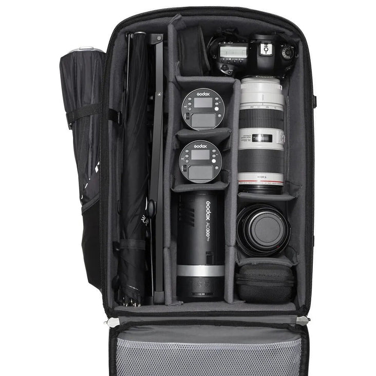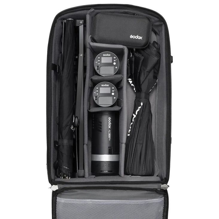 The Roller Carrying Bag CB-17 from Godox is designed to transport and store the AD1200 Pro Battery Powered Flash System set. The case can contain multiple AD100 and AD300 Flashes and related accessories. It features a folding handle and casters for easy transport, plus two exterior zippered pockets, and a pair of exterior straps for attaching a light stand or tripod.