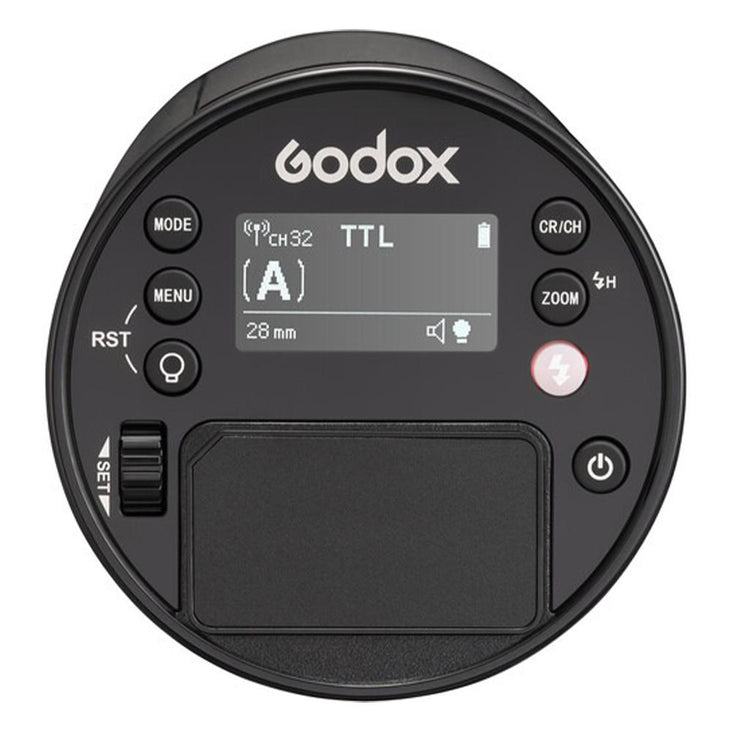 Manual mode outputs the user's choice of power, modelling light, and first or second curtain sync. Multi mode controls the stroboscopic rate up to 90 times (90 Hz). Optional wireless transmitters with 32-channel and four groups system control flash mode, first and second curtain sync, High-Speed Sync up to 1/8000 second, power level, and modeling lamp at distances up to 328'. Firmware updates are obtainable on the Godox website.