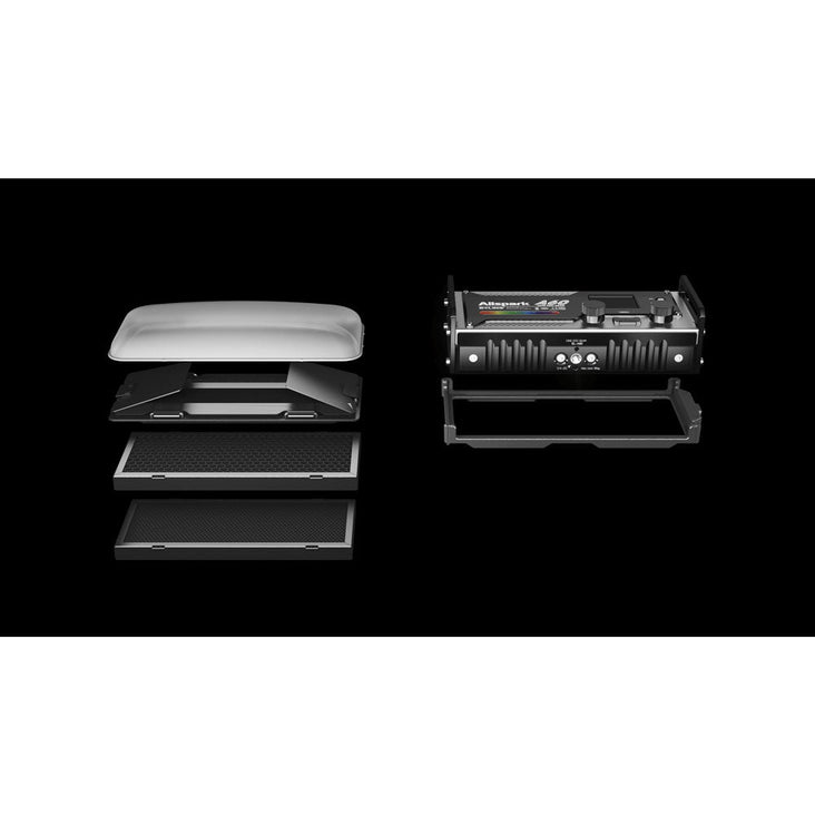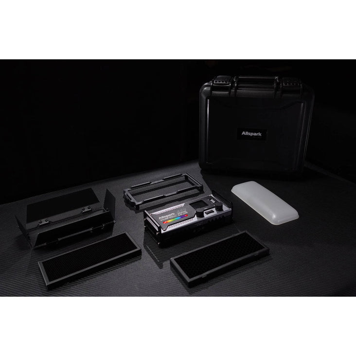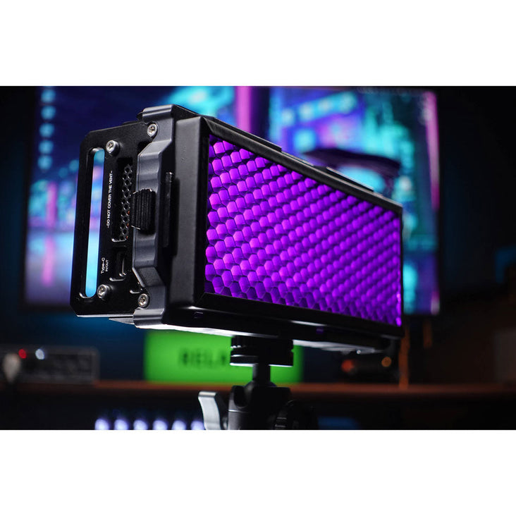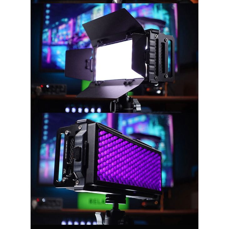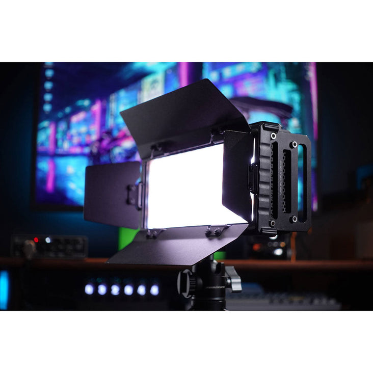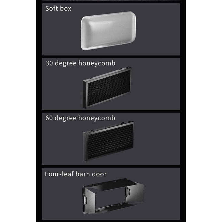 - Includes diffuser, barn doors, and honeycomb grid for customizable lighting
