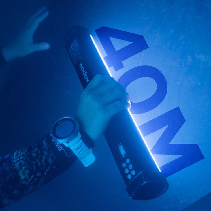 Designed to light up your underwater photo and video productions, the WT60D Daylight Dive Tube Light from Godox combines consistent performance and easy handling. This versatile 25" tube-shaped light has a depth rating of 131' and provides illumination from multiple angles. When submerged, the 5600K CCT light automatically switches to higher power, outputting up to 1940 lux at 3.3'. CRI/TLCI scores of 96 ensure colour accuracy, and 13 preset special effects simulate a wide range of creative shooting scenes. Thanks to its fluorescent buttons, the light can operate in complete darkness to reveal the wonders of sea life. A runtime of up to 2 hours assures you will have a bright, diffused, and even light throughout your dive. A built-in OLED panel efficiently shows the light's battery level. A bag and a power adapter are included for convenience.