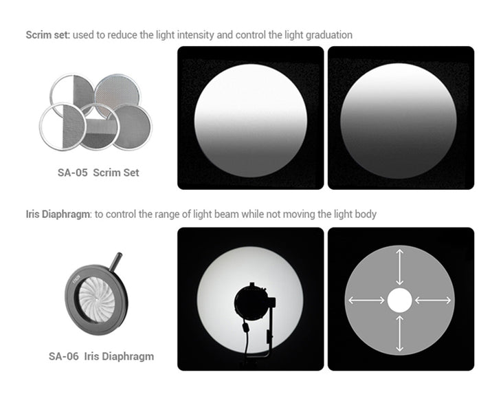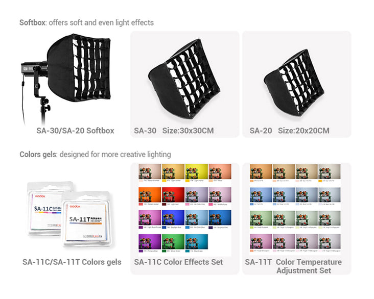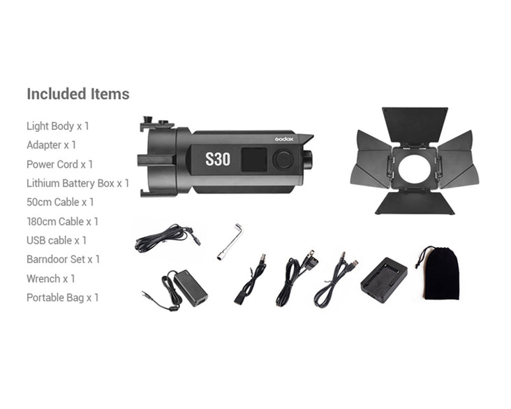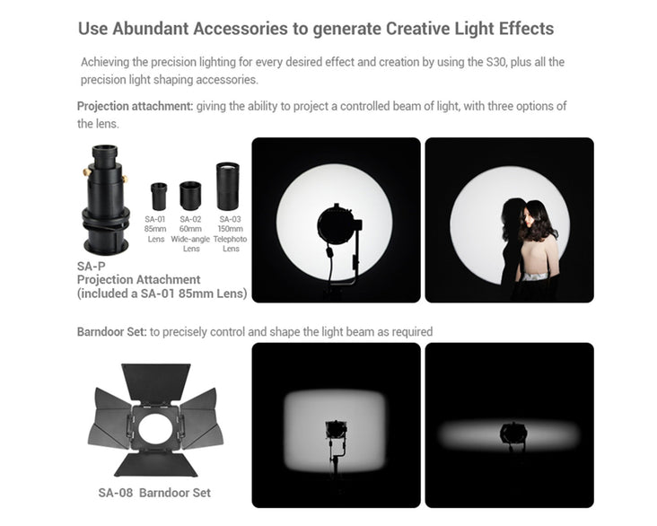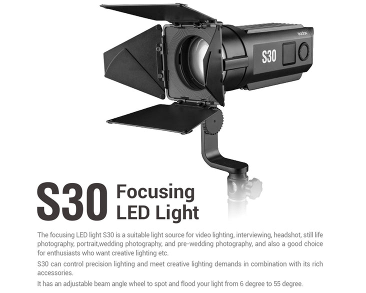 The Godox S30 5600K Focusing LED Light comes with a SA-08 Barn door. The S30 is suitable for video lighting, interviewing, headshots, still life photography, portraits, wedding photography and is a good choice for enthusiasts who want creative lighting.