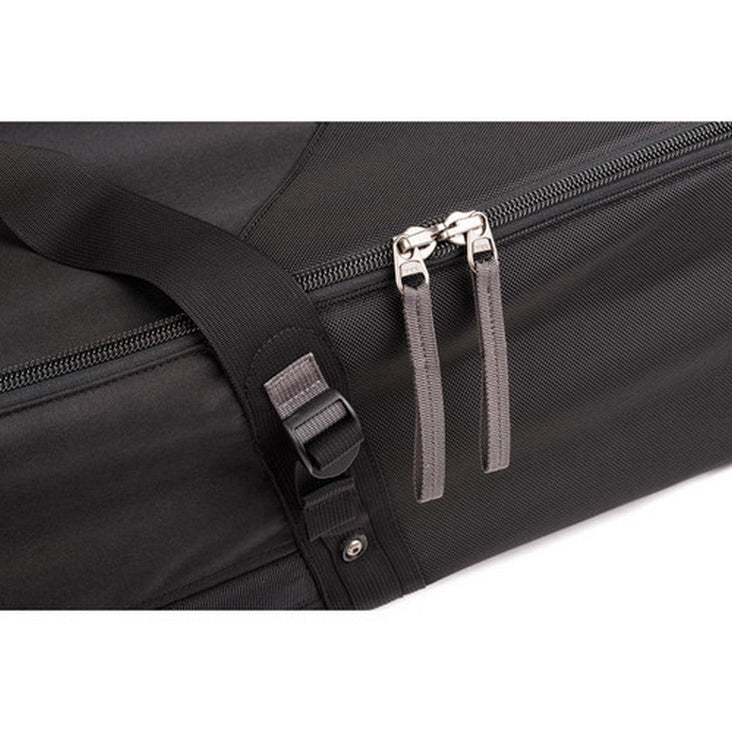 With its lid zippered shut, the Stand Manager 52 can be positioned on its wheels and bottom bumper, measuring up to 54" high, 12.5" wide, and 8" deep along its exterior. Handles are attached to the top, bottom, and both sides of this rolling case for flexibility while transporting or moving the Stand Manager 52; making pickup and placement into car trunks or onto an elevated surface easy. Additionally, dual carry straps that can be joined using an integrated handle wrap allow this rolling case to be lifted with its top lid facing upward. Adjustable webbings are also built-in along the sides of the Stand Manager 52. When tightened, these webbings reduce the depth of this rolling case by up to 3.5".