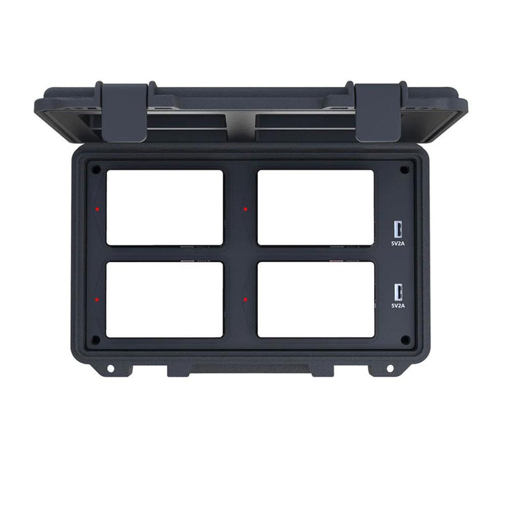 The included case holds the four MC fixtures and can be used to wirelessly charge the lights using the included power supply. The case also incorporates two 5 VDC USB power ports for charging mobile accessories.