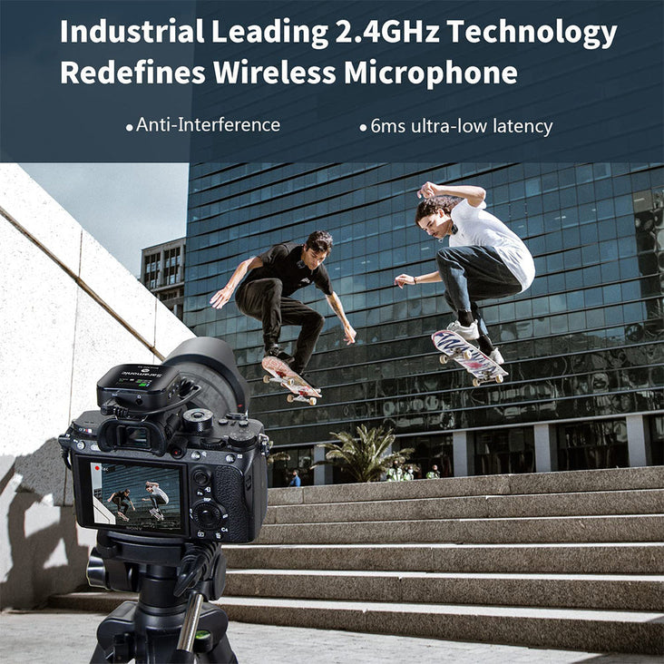 - Two clip-on transmitters with built-in omnidirectional microphones