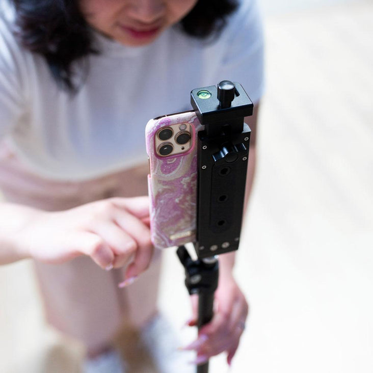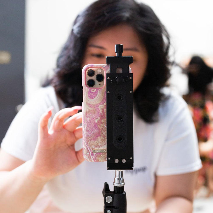 The bracket offers a 1/4" thread which is compatible with most tripods, ball heads and light stands. When paired with a stand or tripod this is the perfect setup for filming or shooting content for Instagram, Snapchat, Facebook, Twitter and life-streaming platforms.