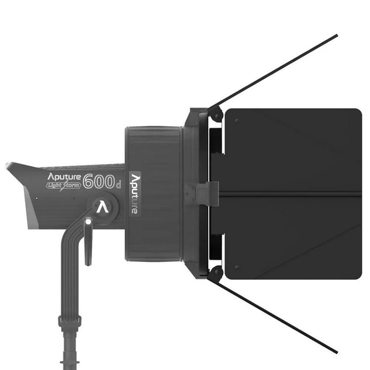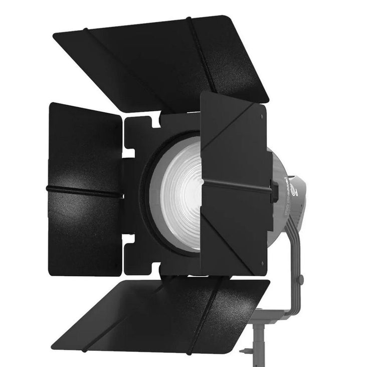 The 25cm F10 Barndoors for the LS 600D Fresnel Attachment from Aputure offer a means to control the 15 to 45° beam spread range of the Fresnel. Simply swing one or more leaves into the beam path to light areas you want and to keep light from areas you don't want illuminated.