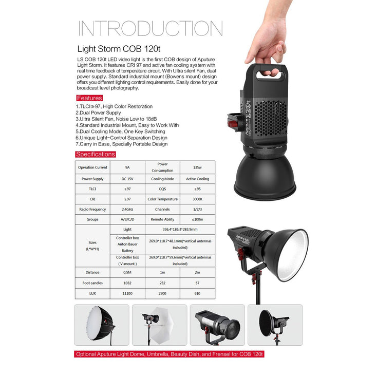 The brand new Aputure LS COB (Chip on Board) 120t LED video light is the first COB design of the Aputure Light Storm. It features a CRI 97+ rating and an active fan cooling system with real time feedback of the temperature circuit. With an ultra silent fan, dual power supply and standard industrial mount (Bowens S-mount) the design offers you different lighting control requirements.