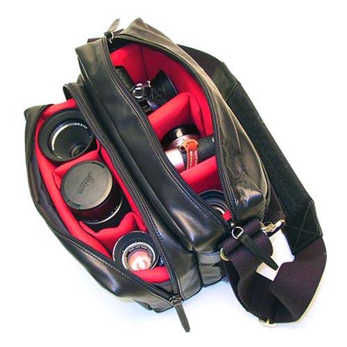 This is a modern container for two Leica bodies and up to five lenses and is made of beautiful, supple glove leather. The spacious zippered front pocket provides ample room for film, a small notebook and pen, filters, a small handheld meter or up to 3 lenses! Both compartments feature removable and repositionable dividers to tailor the bag to your needs. This bag is even versatile enough to carry a small SLR kit and extra lens with no trouble.