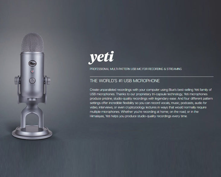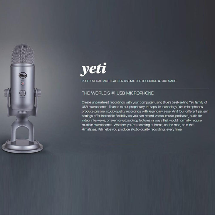 Create unparalleled recordings directly in your computer with Blue Microphone's Yeti USB Microphone. The Yeti uses BlueMicrophone's proprietary tri-capsule technology to produce pristine, studio-quality recordings. It features four different pattern settings so you can record vocals, instrumental music, podcasts, or interviews in ways that would normally require multiple microphones. With simple controls for headphone volume, pattern selection, instant mute, and microphone gain, you'll be creating exceptional recordings right out of the box.