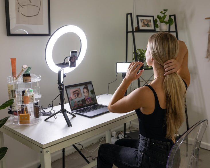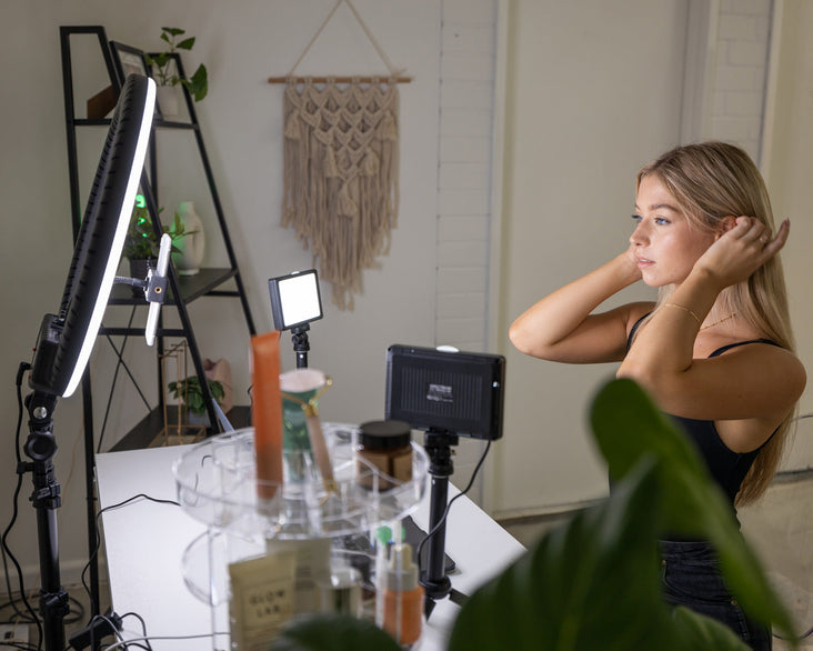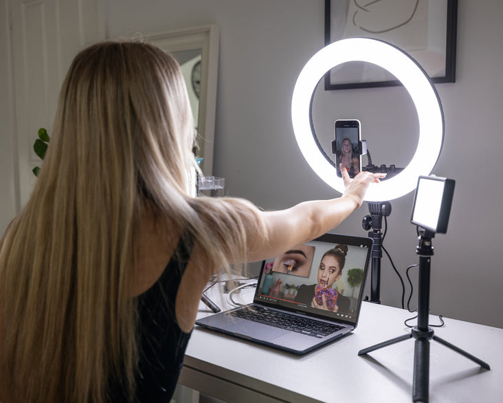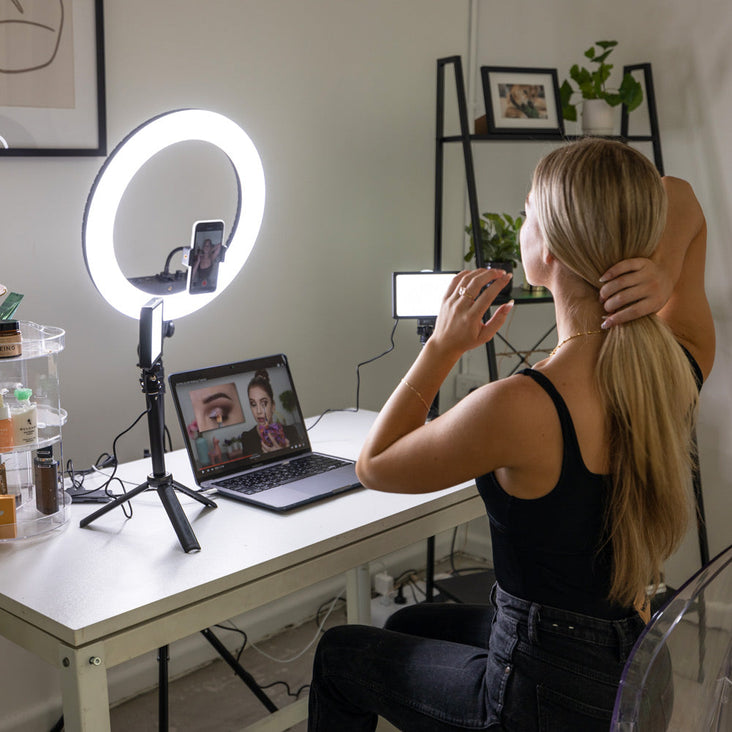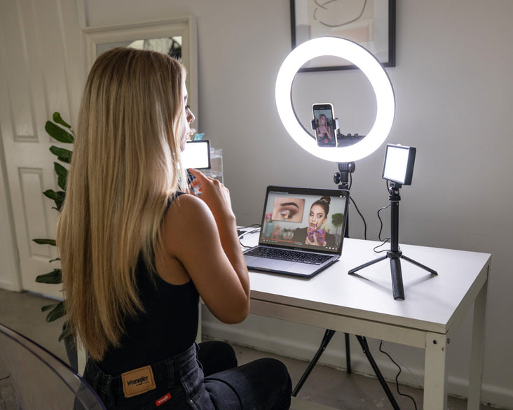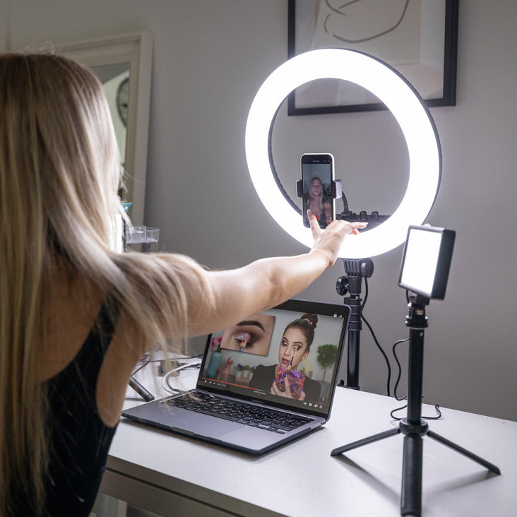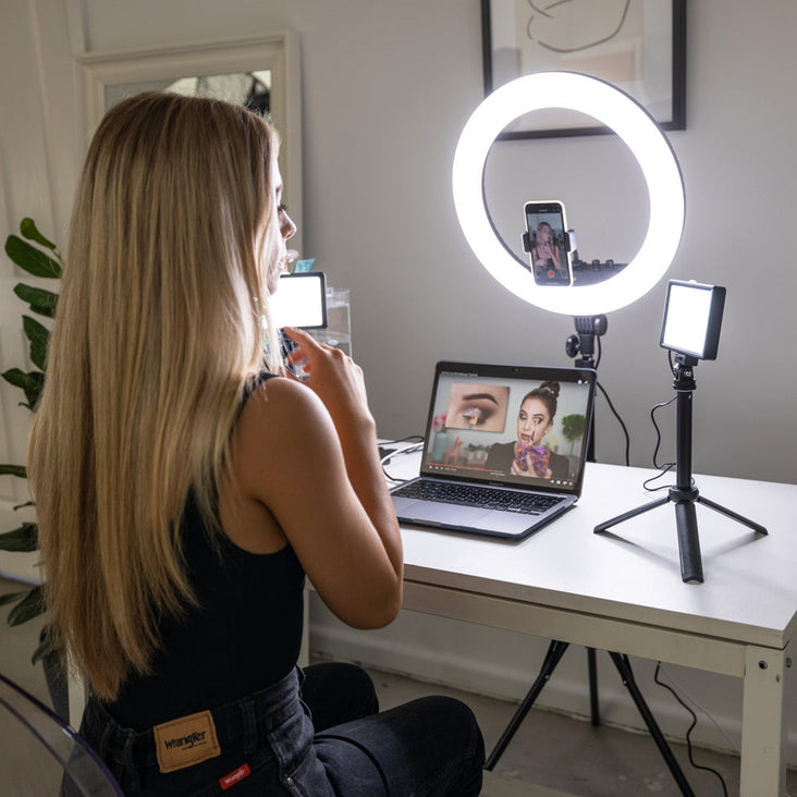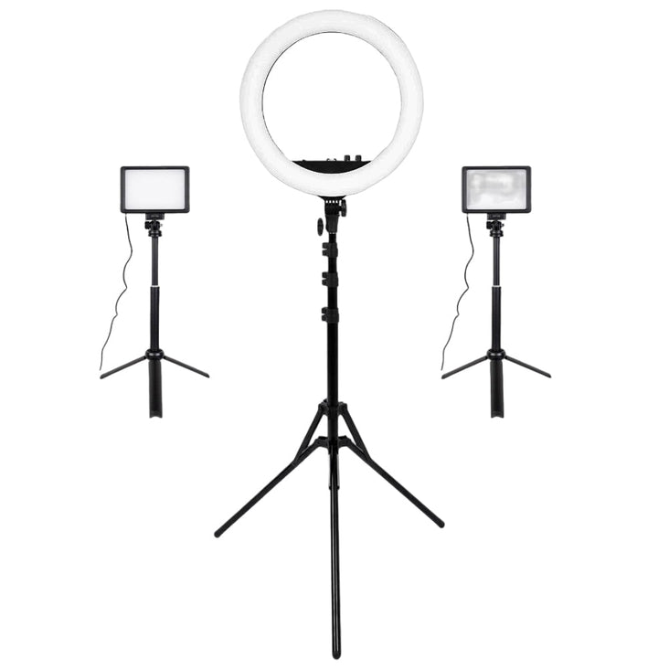 Popular amongst Youtube video bloggers, the Spectrum Aurora 18" Diamond Luxe III Complete Make Up and Beauty Studio ring light with Crystal Air Dual LED Panel Video lighting kit provides an affordable yet professional, bright and flicker free continuous lighting solutions.