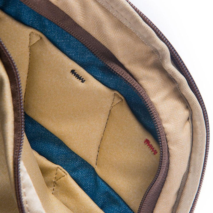 Hypalon-reinforced and bar-tacked stress points. Soft, durable mixed-cotton twill interior for protection, durability and a luxurious feel. The Ash backpacks replace Hypalon touchpoints with natural NuBuck leather. All-custom anodized aluminum hardware.