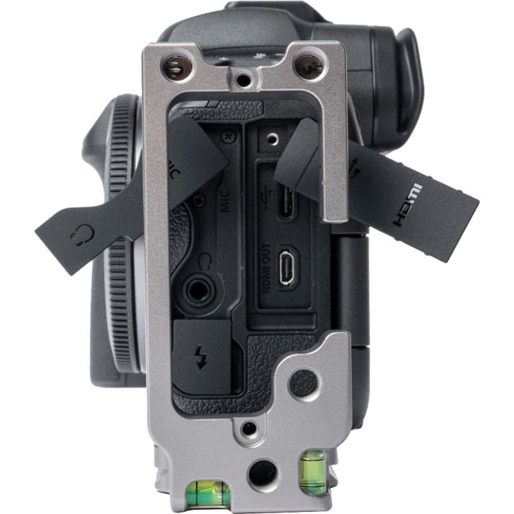 The battery compartment and all side ports are fully accessible, and the flip-out / rotating screen of the R5 / R6 has full movement allowing it to be used in all positions.