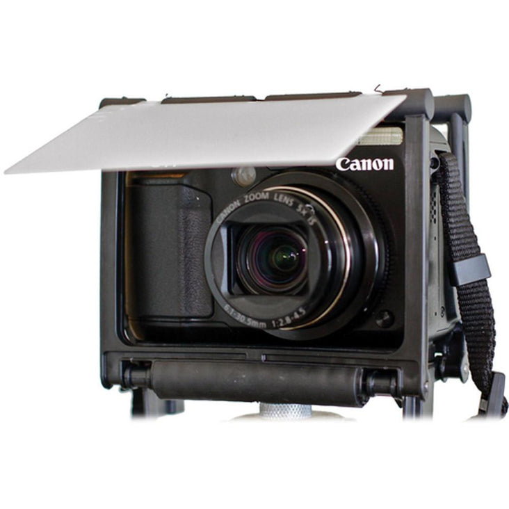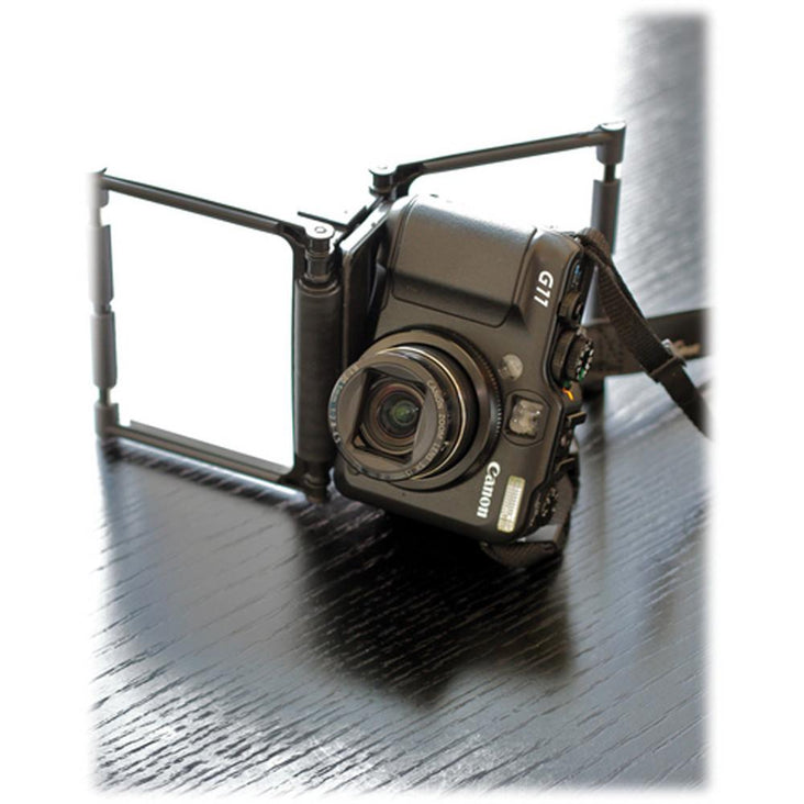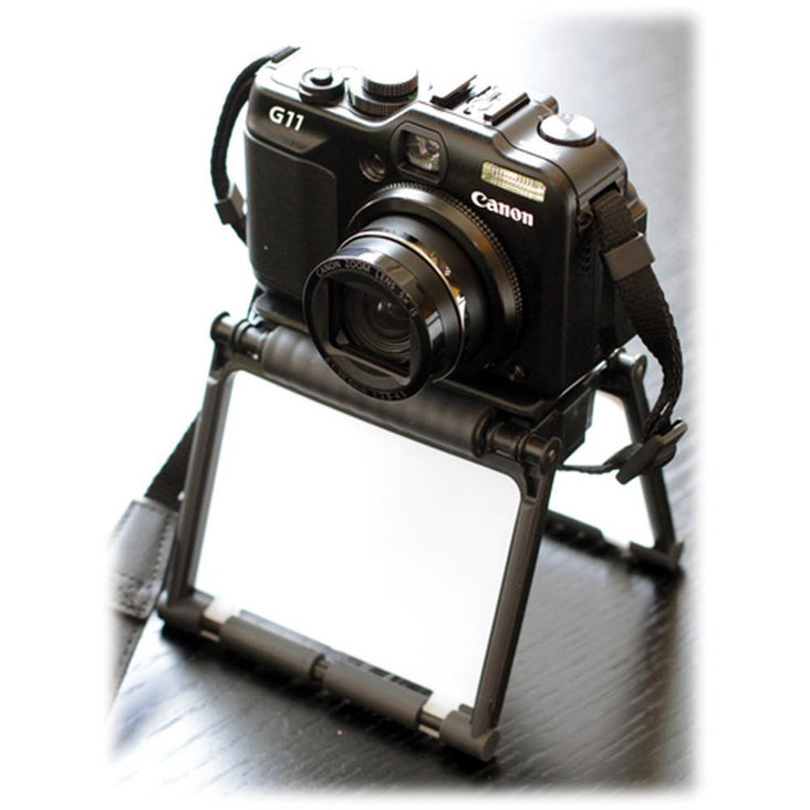 The Gary Fong Flip-Cage PRO is a multi-functional camera support that not only protects your digital or film camera from damage, but you can use it to shoot horizontally, vertically, and even macros. This unique device can be configured to hold diffusion filters to help soften your lighting. This flip cage sits on a table or other flat surfaces.