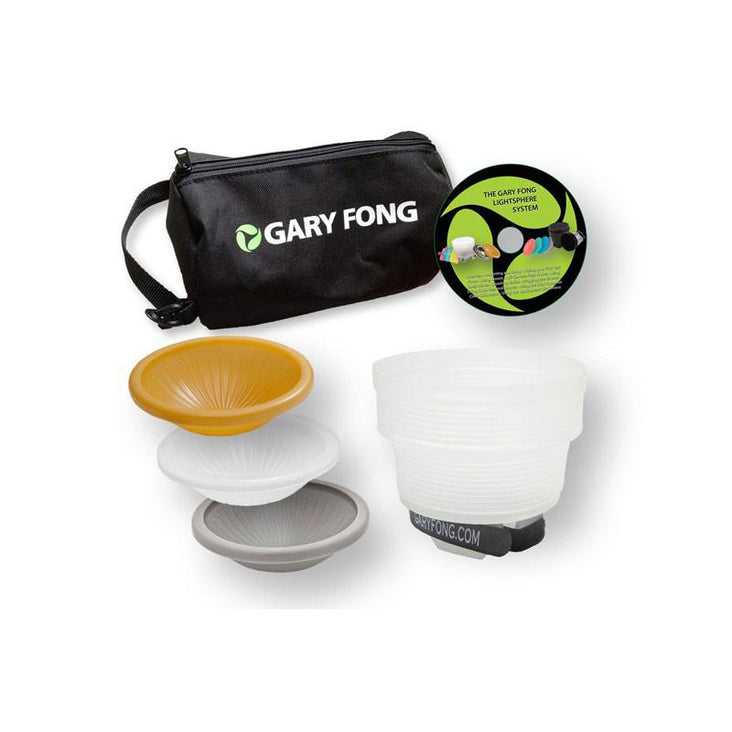 The Lightsphere Collapsible Wedding & Event Lighting Kit from Gary Fong includes the Lightsphere Collapsible with Speed Mount, a WhiteDome, an AmberDome, a GrayDome, an instructional DVD, and a gear bag. This kit is designed to help get you started with modifying the light from an on-camera shoe-mounted flash unit.