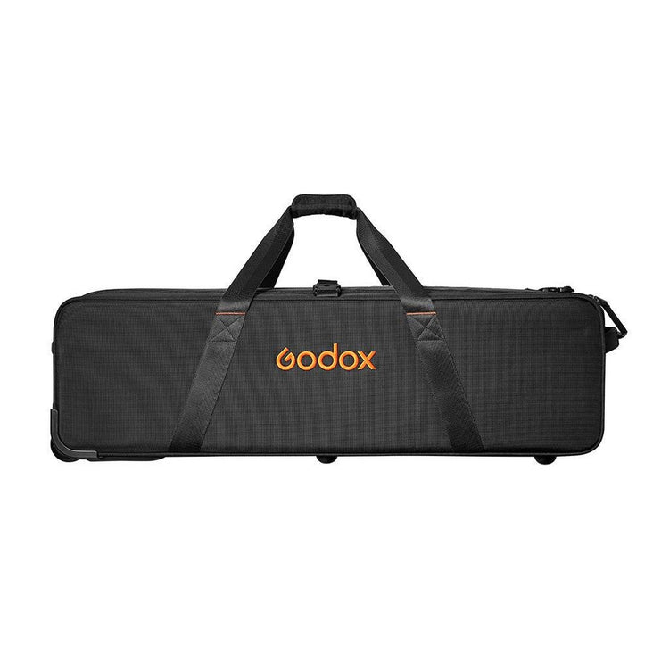 Built tough for travel and everyday studio use, it features reinforced nylon construction, a padded interior with adjustable dividers, smooth-rolling wheels, and multiple carrying options including side handles and a shoulder strap—keeping your equipment organised and protected between shoots.