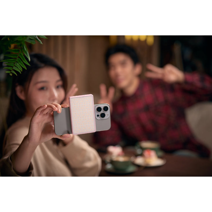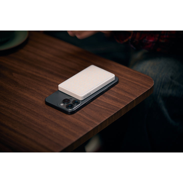 Compact and versatile, the Godox Litemons MA5R RGB LED Light and Power Bank is a pocket-sized 2.68 x 4.21" panel that combines vibrant lighting with phone charging capabilities. Featuring a magnetic wireless power bank, it provides over 220 minutes of runtime after just a 90-minute charge. Perfect for content creators and vloggers, the light offers a selfie mode, 0-100% dimming, and RGB colour versatility for dynamic lighting effects. With 14 pre-programmed effects, creating unique setups is effortless. Easily connect to your phone via onboard controls, Bluetooth, or NFC, and customise settings through the Godox app.
