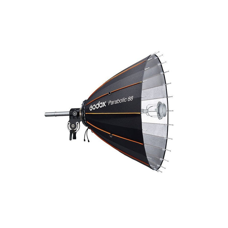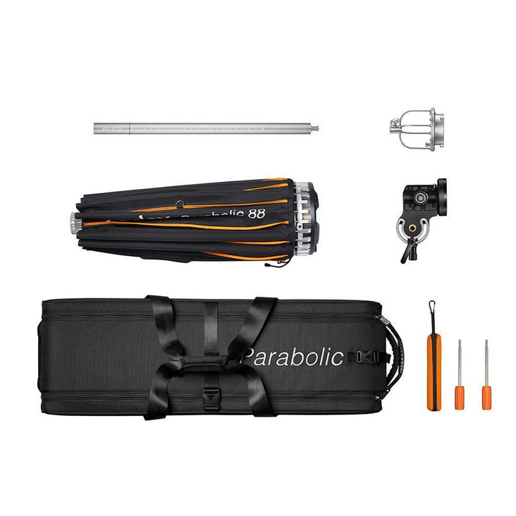 Designed for fashion and portrait photographers, the Parabolic 88 Reflector Kit from Godox offers clean and specular highlights while also providing a broad light source that wraps around your subject. The reflector features a highly reflective silver interior with 35.4" outer diameter. In addition to the large reflector, this kit includes a PF-M focusing Mount, PF-R670 Focusing Rod, PF-BM Strobe Adapter, PB-G1 Grip Kit, and a CB35 Carry Bag.
