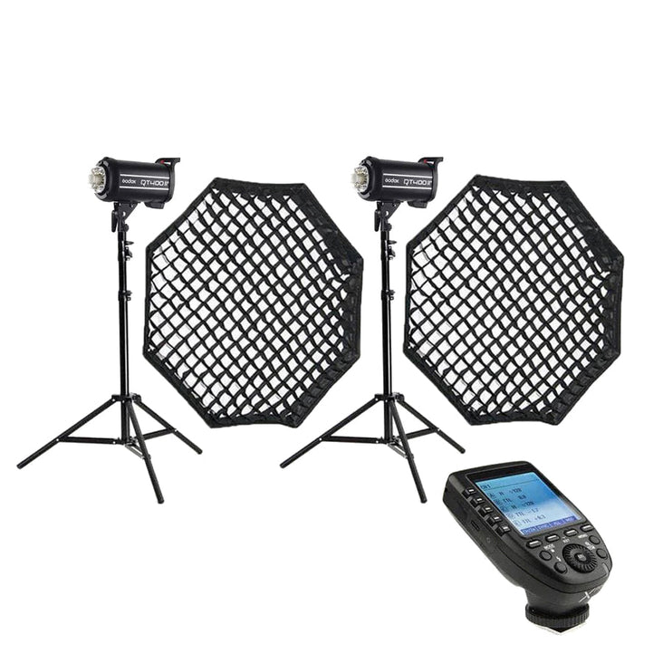 This kit features a pair of Godox QT400iiM strobe heads, heavy duty stands, a pair of large collapsible 120cm octagon soft boxes and Godox XPro trigger (please specify which camera model you require).