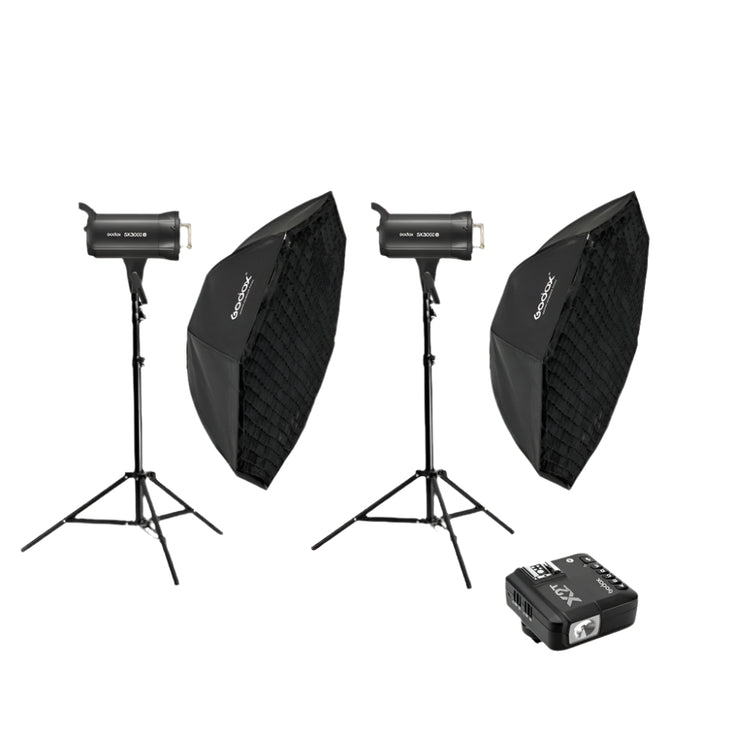 This kit features a pair of Godox SK300KII-V strobe heads, heavy-duty light stands, a pair of large octagon soft boxes and a Godox X2 trigger (please specify which camera model you require).