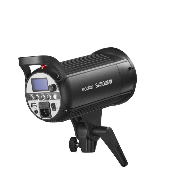 The SK300II-V Studio Flash from Godox is a 5700K daylight-balanced flash source that offers solid core and convenience features at a budget-friendly price point. The SK300II-V is the latest version that features a 10W LED modelling lamp and a faster 0.1 - 1.5s recycle time. It also features flash durations as short as 1/2000 sec. Power is variable from 1/16 to 1/1 full power, adjustable in 40 steps. Settings are accessed via rear panel push buttons and displayed on the easy-to-read LCD screen. Triggering options include native compatibility with Godox's 2.4GHz X trigger system (X2T and XPro), sync cord, test button, and slave triggering.