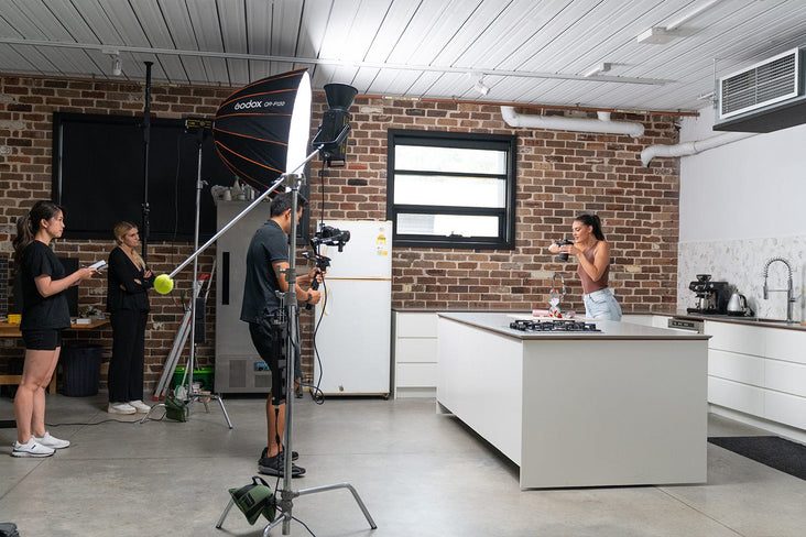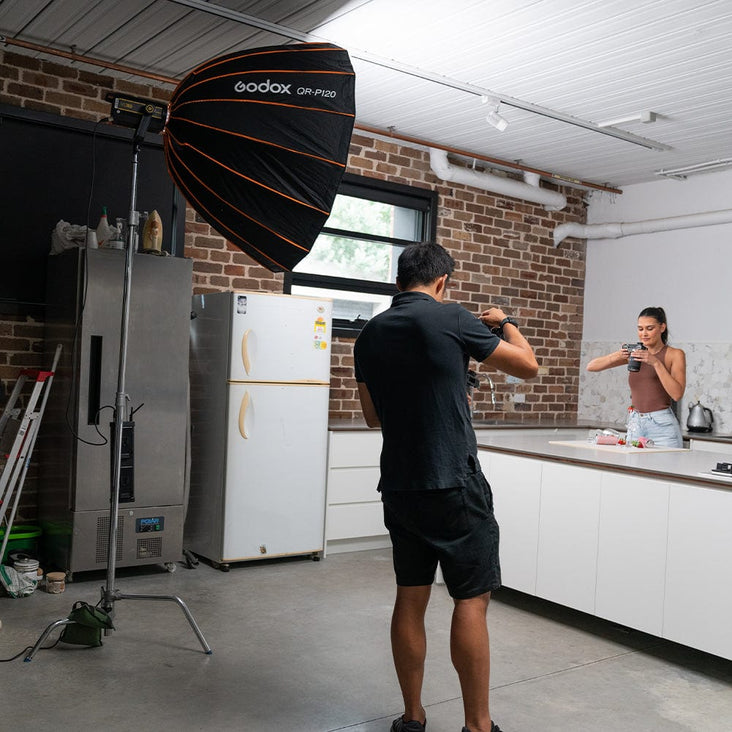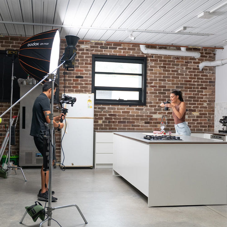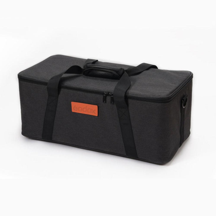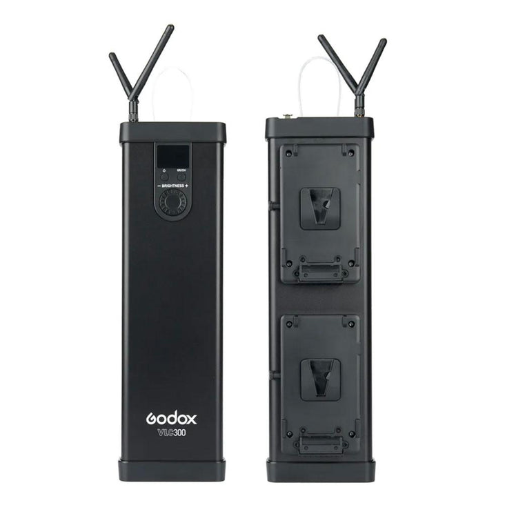 The controller box contains dual V-mount battery plates, and an LCD display with intuitive controls and command dial for making adjustments to the light body locally. Setting can also be adjusted wirelessly using the the optional remote (sold separately), or by using Bluetooth-enabled portable devices with the GodoxPhoto app, available as a free download for iOS and Android devices.