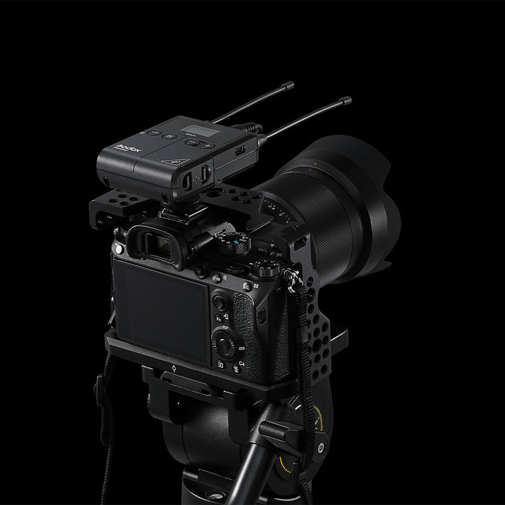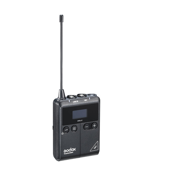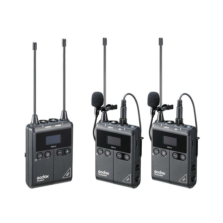 The WmicS1 UHF Lavalier Wireless Microphone System from Godox comes with 1 RX1 UHF Wireless Receiver and 2 TX1 UHF Wireless Transmitter.
