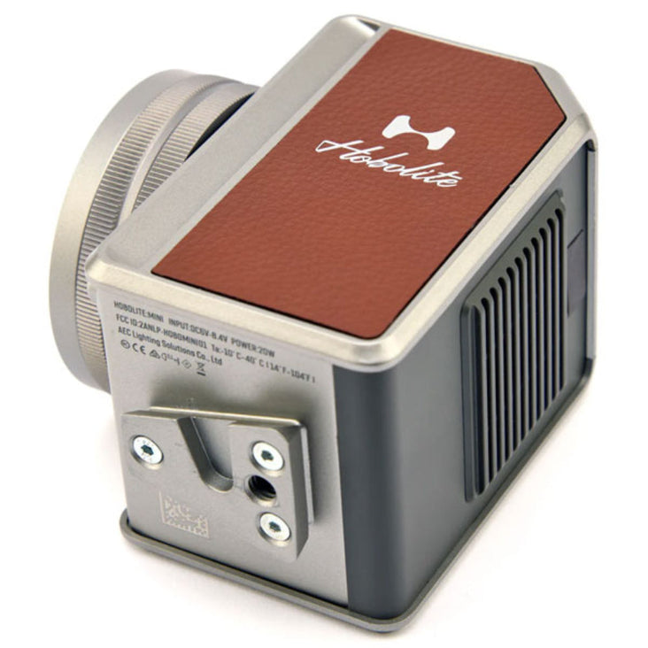 Powered by a built-in Li-Ion battery (3000mAh 7.4V, 22.2Wh), the Mini will run for 50 minutes at full power. Connect the Hobolite 95kWh external V-mount battery for run times in excess of 6 hours for portable and continuous shooting.