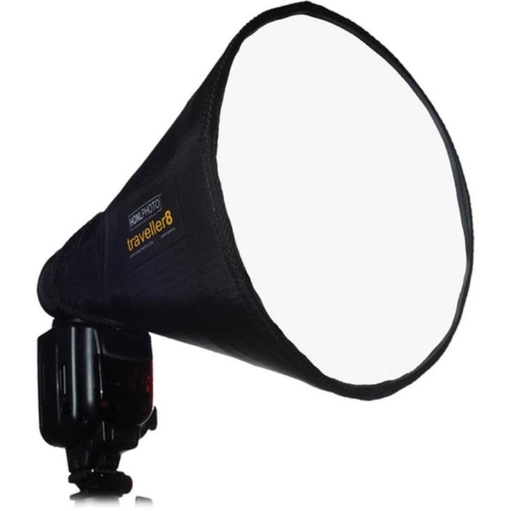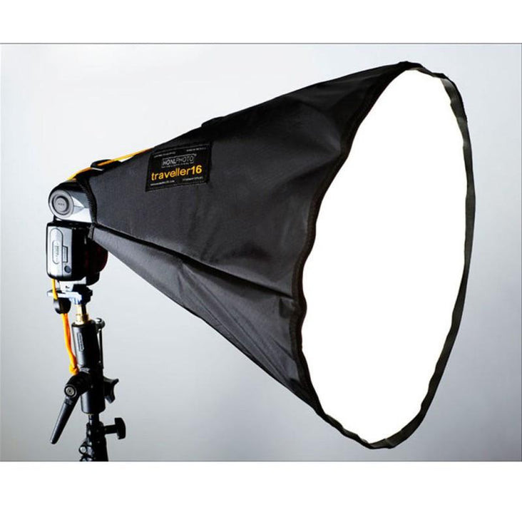 Create beautiful soft light from David's patented softbox design, with the quality and sturdiness you've come to expect from all Honl Photo Professional lighting products. Extremely easy to setup and attach to your shoe-mount flash unit using our popular Speed Strap (included). Large 16" front diffuser with a removeable interior light baffle. Folds flat to tuck into your camera bag, and weighs in at less than a pound. Provides a pleasing circular catchlight in your subject's eyes. Fits most any larger shoe-mount flash by Nikon (SB900) or Canon (580) as well as larger units like the Vivitar 285.
