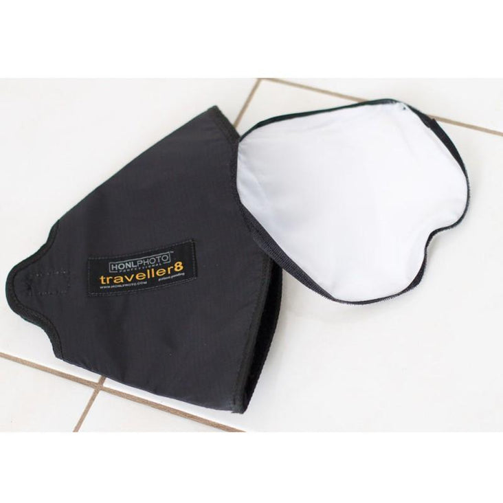 Create beautiful soft light from David's innovative new softbox design, with the quality and sturdiness you've come to expect from all Honl Photo Professional lighting products. Extremely easy to setup and attach to your shoe-mount flash unit using our popular Speed Strap (included). Folds flat to tuck into your camera bag. Provides a pleasing circular catchlight in your subject's eyes. Fits most any shoe-mount flash by Nikon or Canon as well as larger units like the Vivitar 285.