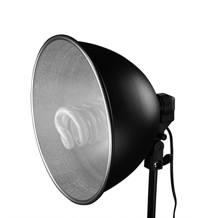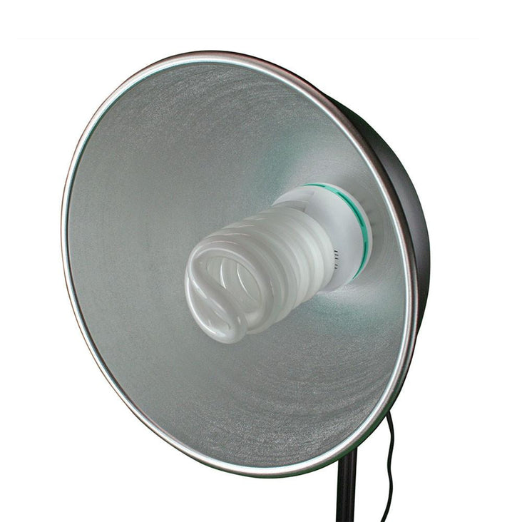 The 28cm silver reflector dish with E27 mount is the perfect companion to the E27 single bulb holder to create a continuous lighting solution. It shapes the light perfect and a diffusion sheet can be pegged to the front of the reflector dish for further diffusion.