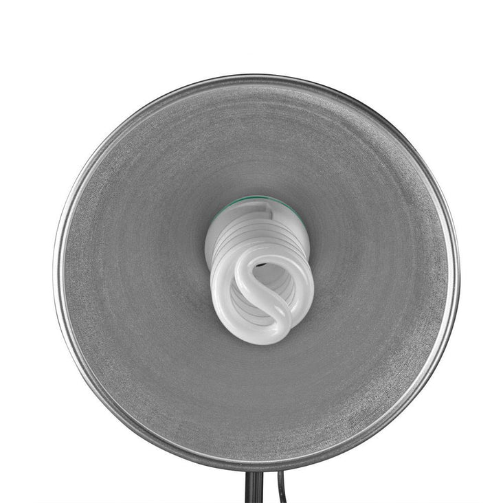 The 28cm silver reflector dish with E27 mount is the perfect companion to the E27 single bulb holder to create a continuous lighting solution. It shapes the light perfect and a diffusion sheet can be pegged to the front of the reflector dish for further diffusion.