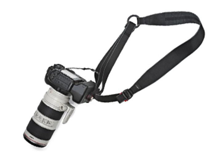 The black with charcoal Pro Sling Strap for DSLRs from Joby is a thin and lightweight, form-fitting, retractable strap for people with t-shirt sizes from L-XXL. It holds, and provides instant-access to, your DSLR with a battery grip and a telephoto zoom lens. As an added security measure, the strap also features a separate camera tether, which provides a second attachment point for your DSLR.
