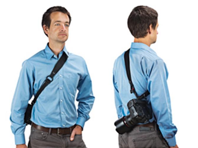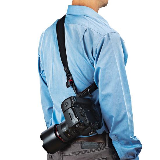 The Pro Sling Strap features an innovative SpeedCinch pulley system, which is a two-part camera retrieval and locking mechanism. First, it allows you to quickly retrieve your camera from an adjustable and retractable strap across your body. Second, it allows you to lock your DSLR at your back, preventing your camera from swinging and bouncing around. To return to shooting, simply unlock your camera and draw it forward in an upward arc motion; the strap doubles in length as the smooth material allows you to bring it up to eye-level.
