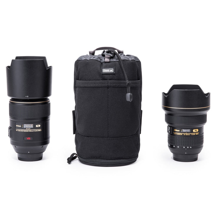 Modular pouch holds a 24–70mm f/2.8 lens with lens hood in shooting position, or other similar size lenses