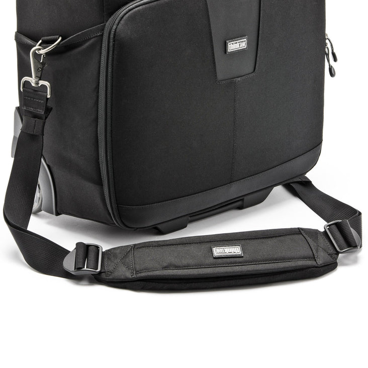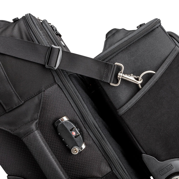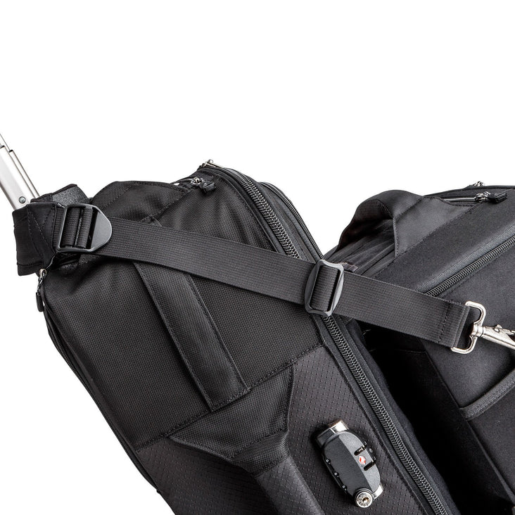 Split-pad strap that lets you hang your shoulder bag off most pieces of rolling luggage