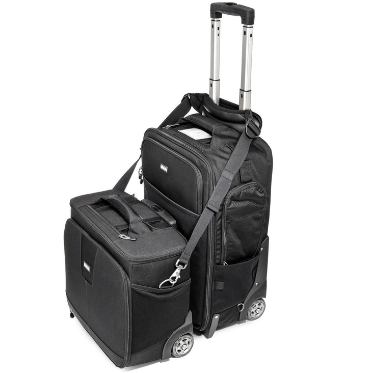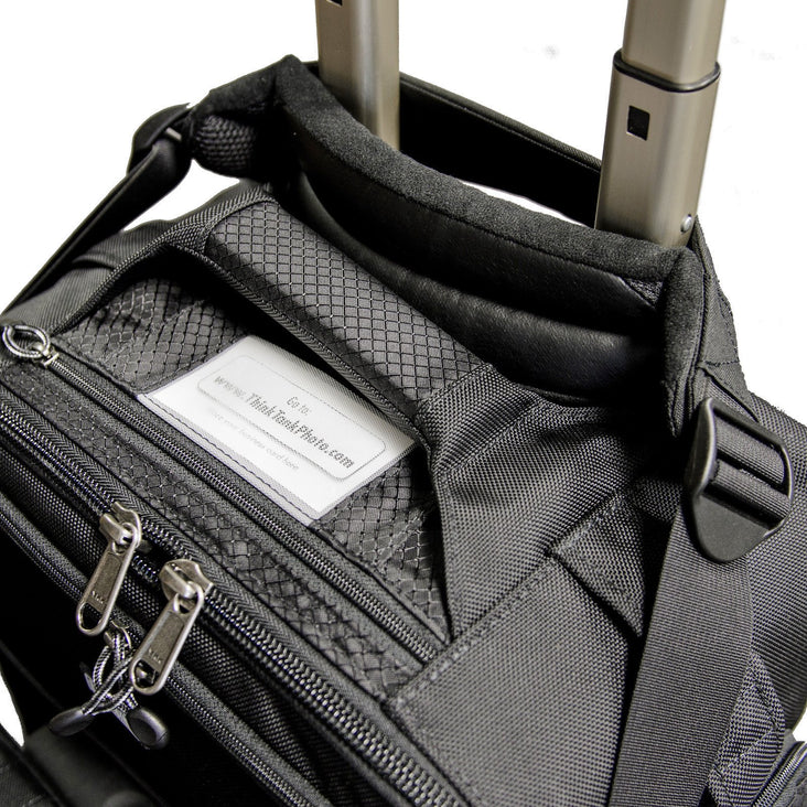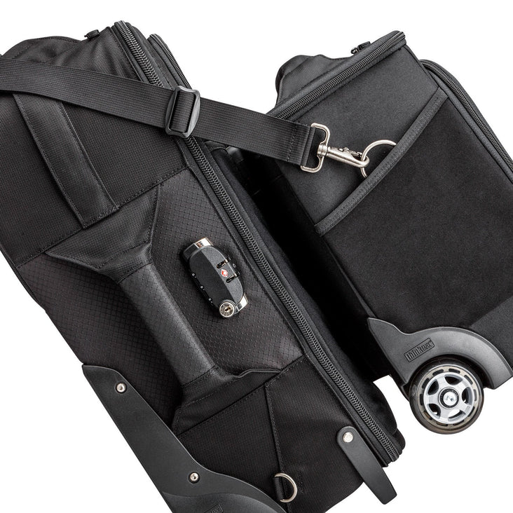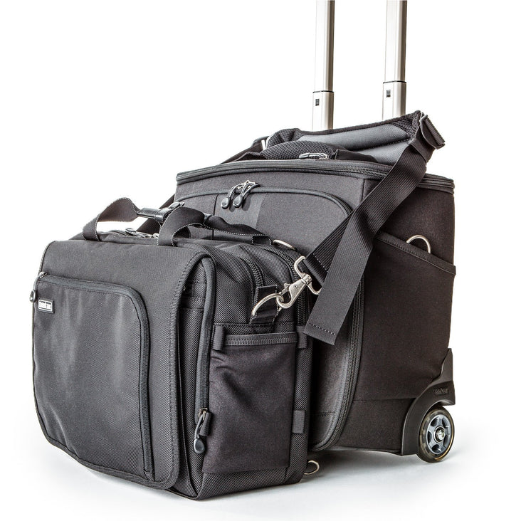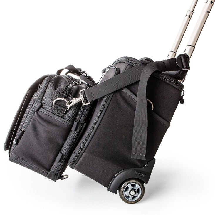 - Hang your shoulder bag off most pieces of 2-wheeled rolling luggage