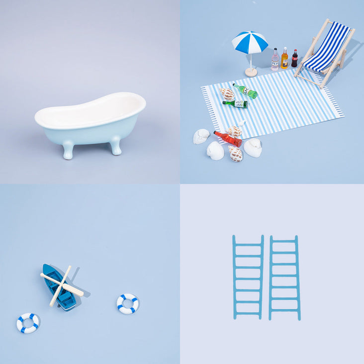 So Kawaii! Bring your product photos to the next level with our cute ‘Oasis Blue’ miniature props. The collection includes beach mini props, a mini row boat with life buoy rings, a mini bathtub, and a pair of mini ladders. These are perfect for cosmetic, skincare, food, beverage, jewellery, or wellness product photography. Start creating scroll stopping content for your social media accounts and website today!
