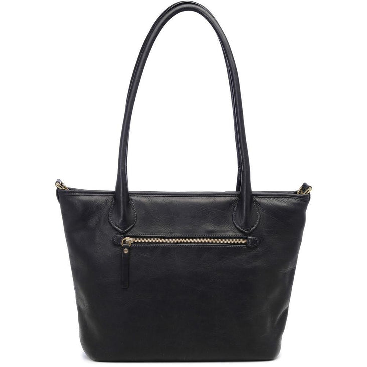 The tote bag features a secure zippered closure. For accessories, there are two interior slip pockets and one exterior zippered pocket at the back. The bag features a luxurious leather trim, and two soft leather grip handles at the top.