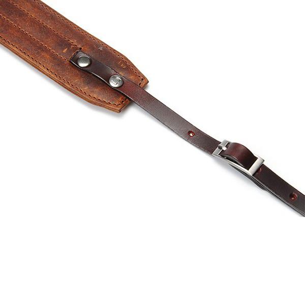 This handcrafted strap has a neoprene padded waxed canvas neckline for comfort, and chrome hardware accents.