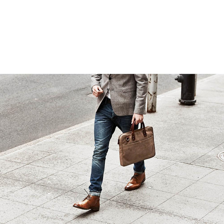 Whether at home, on the go, or at the office, The Kingston Briefcase in field tan and made of waxed cotton with leather accents from ONA is designed to attractively store and protect your up to 15 inch laptop, related accessories, cell phone, iPad mini, pens, and a few documents or magazines. The Kingston features a zipper closure, interior, slip-in, organizational pockets, and an exterior, slip-in pocket for flat items such as a magazine or guidebook. Carry your briefcase with the rounded, twin top handles or with the wide, adjustable shoulder strap, which attaches to two, large, metal D-ring located one on each side.
