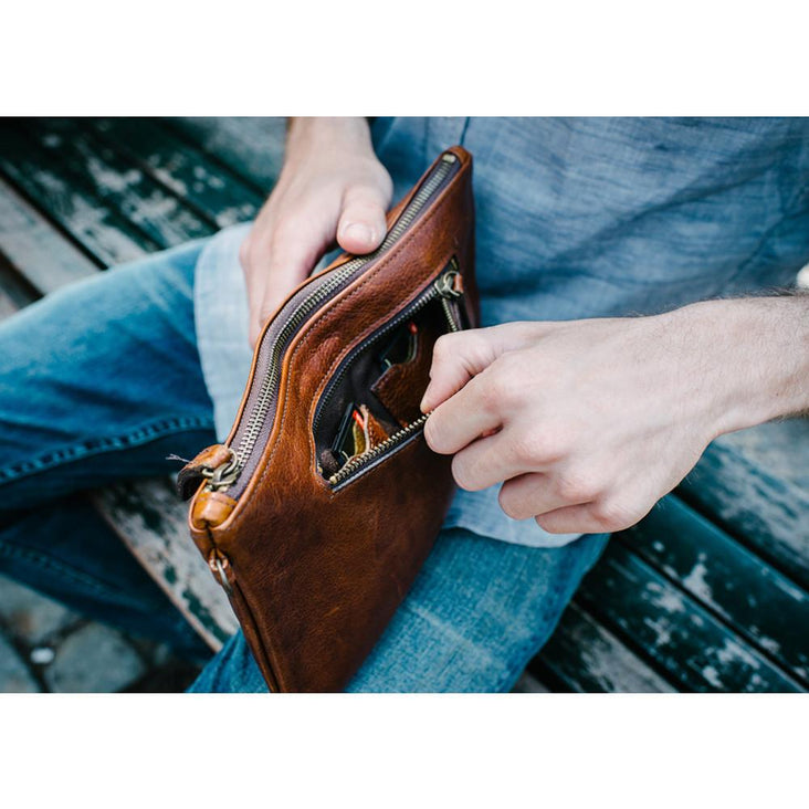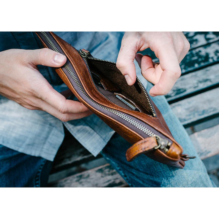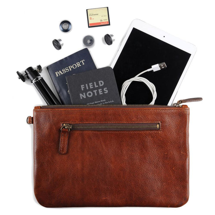 Protect and transport small items with The North Sound Photo Accessories Case, in walnut, from ONA. It accommodates an iPad mini or smartphone along with 1-2 mobile photography lenses and small essentials, such as batteries, lens caps, and cloths. Additionally, a front zippered pocket provides slots for 4 memory cards. The North Sound is handcrafted from Italian leather and features antique brass zippers. It can be carried by hand or via the detachable wrist strap.