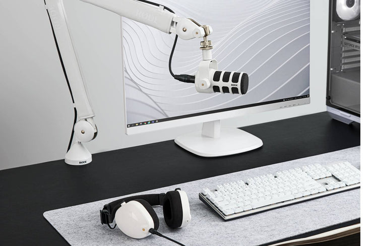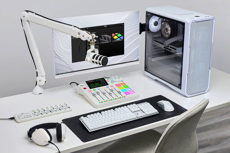 Monitor your audio confidently and comfortably with the white Rode NTH-100, a set of professional headphones designed for all forms of content creation, including mixing, audio and video production, location recording, podcasting, streaming, and daily listening. Featuring custom-matched 40mm dynamic drivers housed in over-ear, closed-back earcups with precision-engineered acoustic construction, the NTH-100s deliver a balanced, "unhyped" tonal signature, clarity, and extended bandwidth. Enjoy excellent passive isolation from external sounds and no leakage into your room or microphones, ensuring top-quality audio monitoring in any environment.