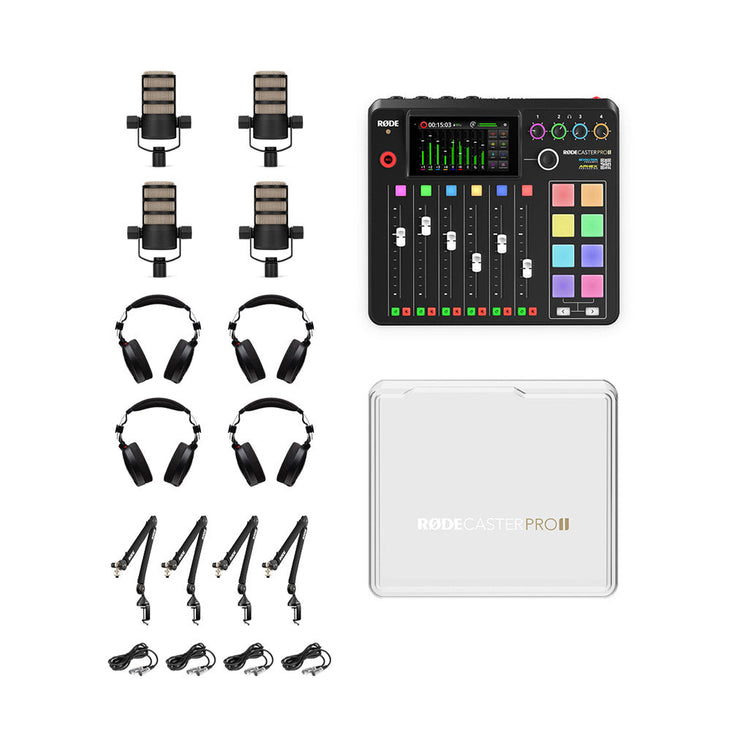 Grab some friends and start a podcast! Everyone is doing it! The Rode Ultimate 'Quad Pod' Complete RodeCaster Pro II Four Person Podcaster Kit is perfect for making all your podcaster dreams a reality. The kit includes everything you need to create a podcast including Rodecaster Pro II, Cover, Rode Podmics, Rode Headphones, PSA1+ Boom arms and XLR cables.