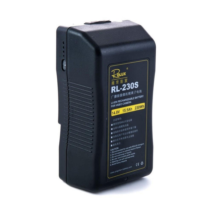 The Rolux 230S V-Mount Lithium-ion Battery is compatible with all the professional video lighting and equipment with compatible V-Mount. It offers high power and is perfect for on location shoots where DC power is unavailable.
