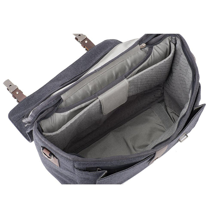 Premium shoulder bag with wool-like fabric and leather detailing fits DLSR gear and a 13" laptop