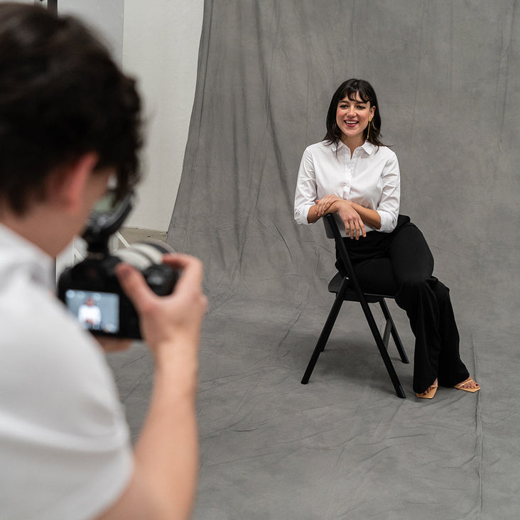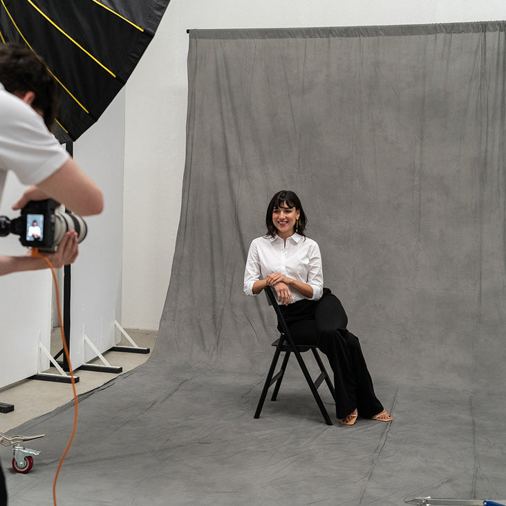 Introducing the Kaleidoscope Muslin 'Set In Stone' backdrop. This versatile light and dark grey backdrop is perfect for school photography, fashion lookbooks, family photography and school photography!